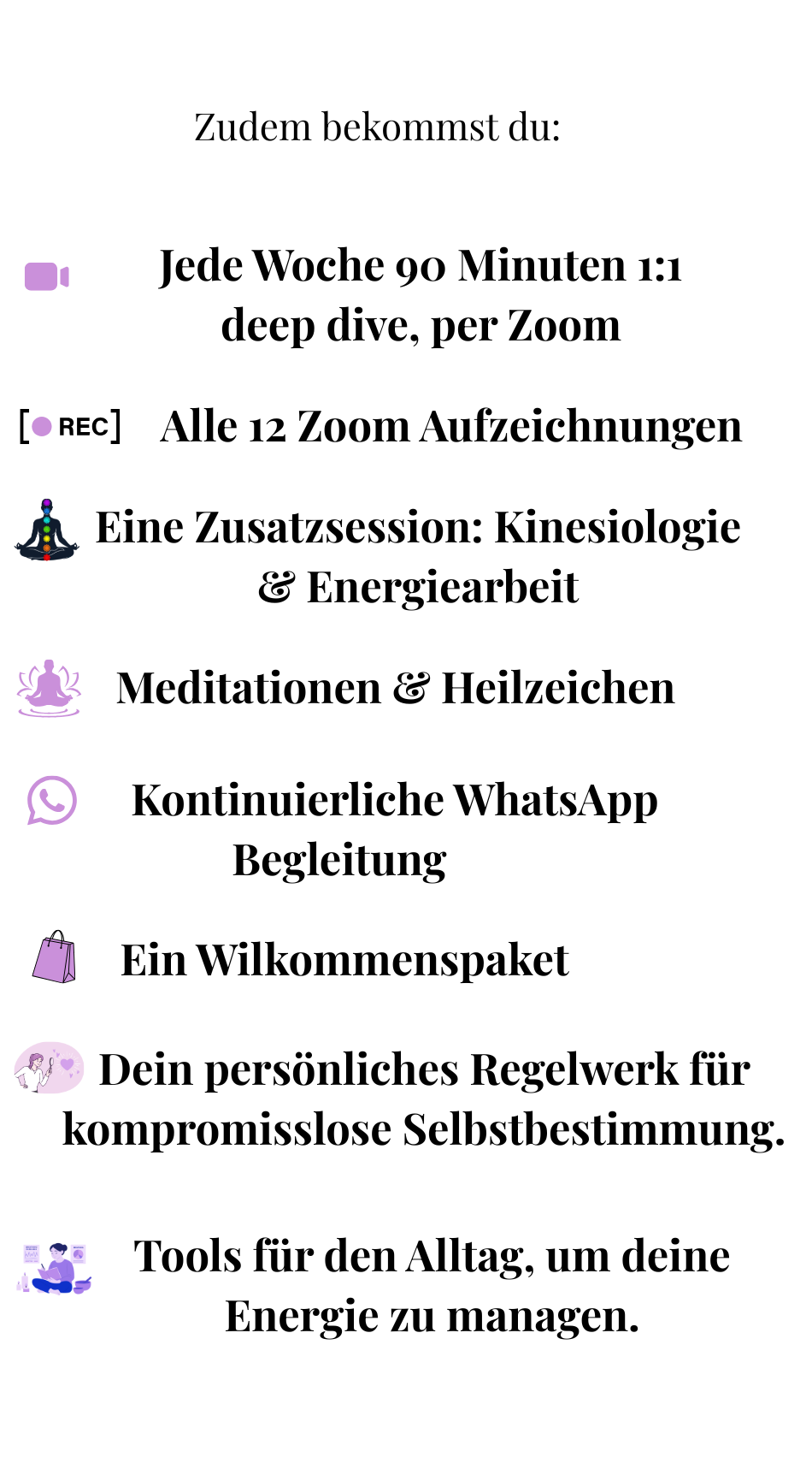 Meine Angebote ersetzen keine medizinische, psychiatrische oder psychologische Behandlung. Bei gesundheitlichen Beschwerden oder Erkrankungen ist es wichtig, ärztlichen oder therapeutischen Rat einzuholen.