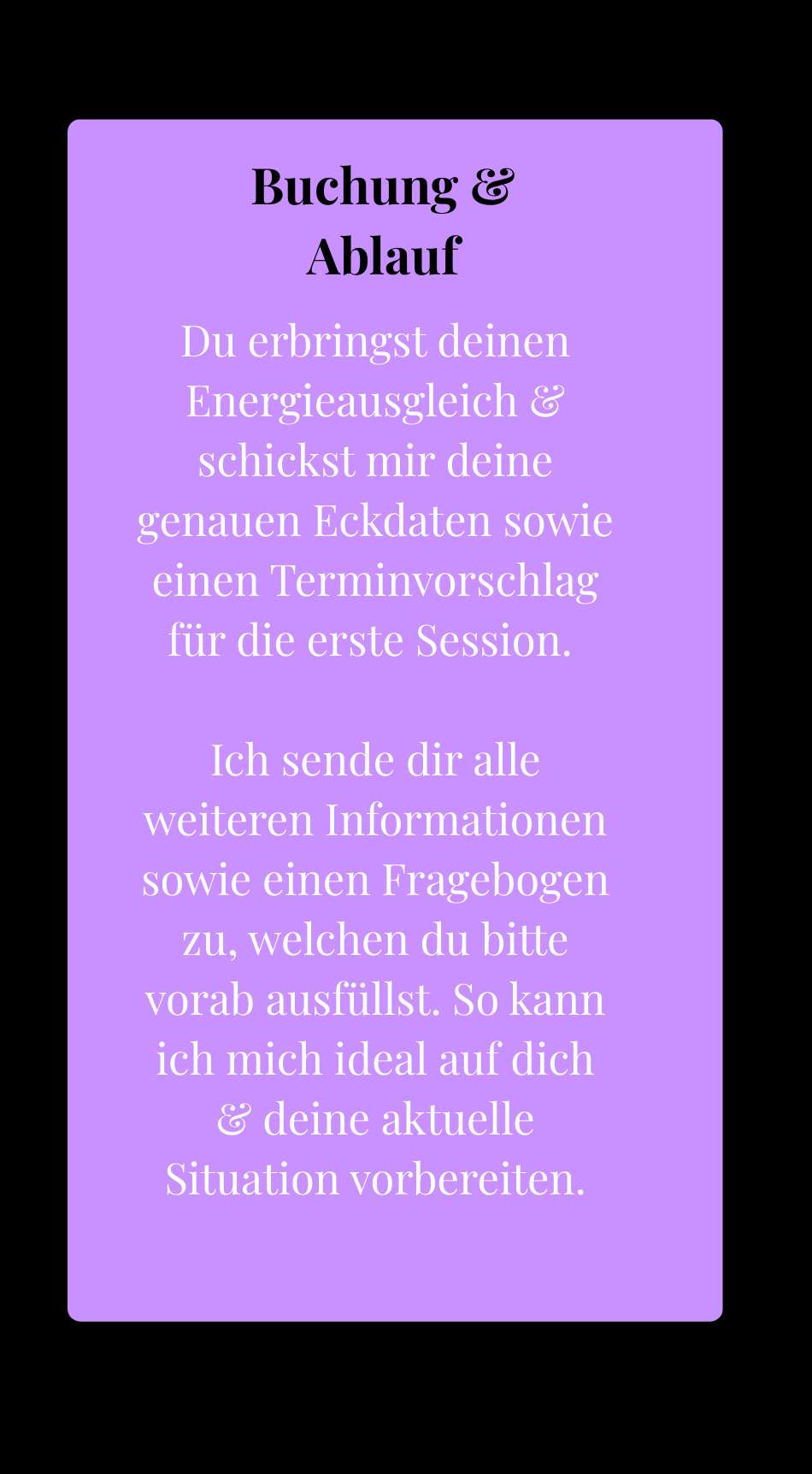 Bitte beachte, dass die Terminbuchung erst nach vollständigem Zahlungseingang verbindlich ist. (Stornierungsbedingungen sind in den AGB zu finden)
