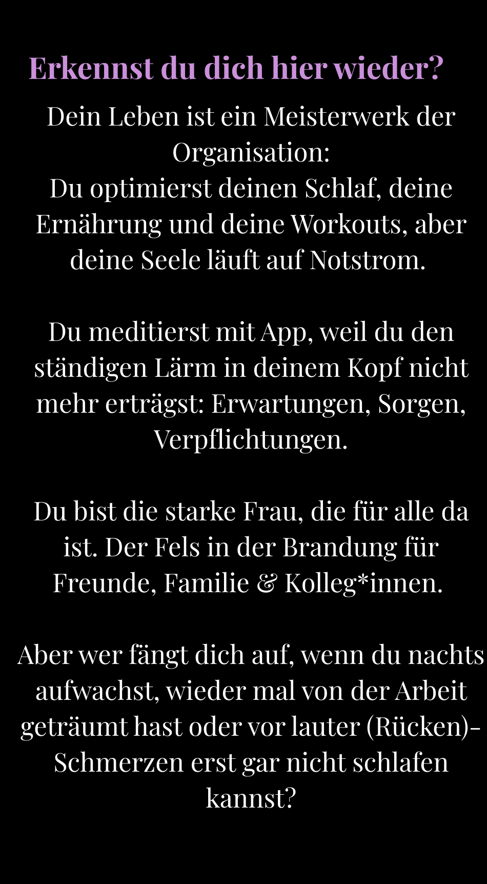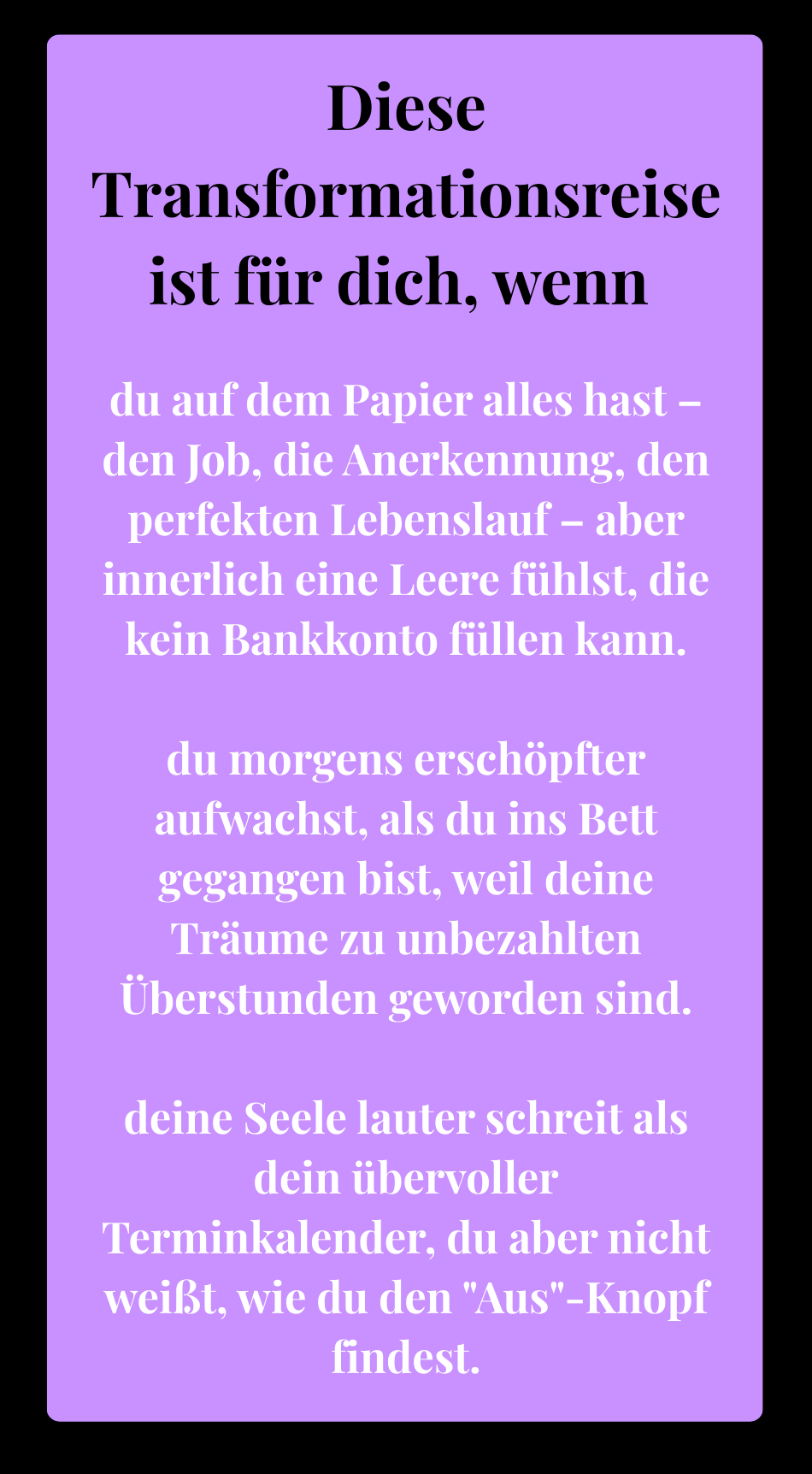 Die Soulprint Journey ist für dich, wenn du dich ausgelaugt und erschöpft fühlst und dich nach mehr Energie, Klarheit und innerer Kraft sehnst! Wenn du das Gefühl hast, nur noch zu funktionieren und spürst, dass es an der Zeit ist, wieder mehr bei dir selbst anzukommen.