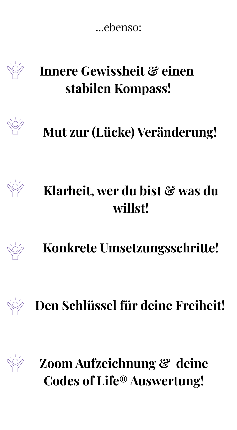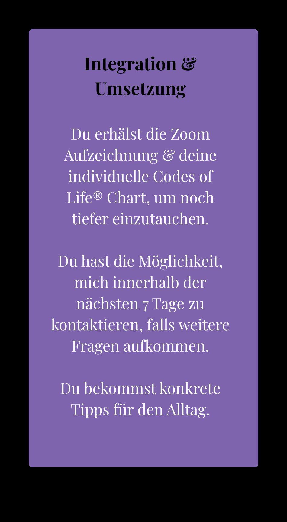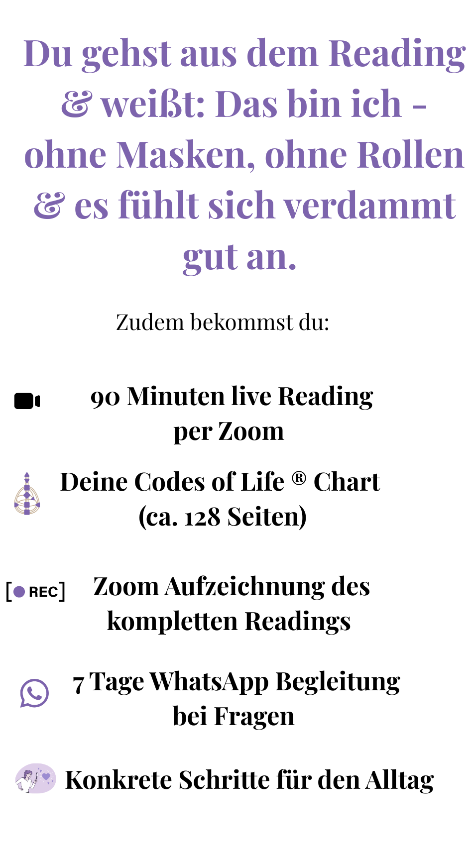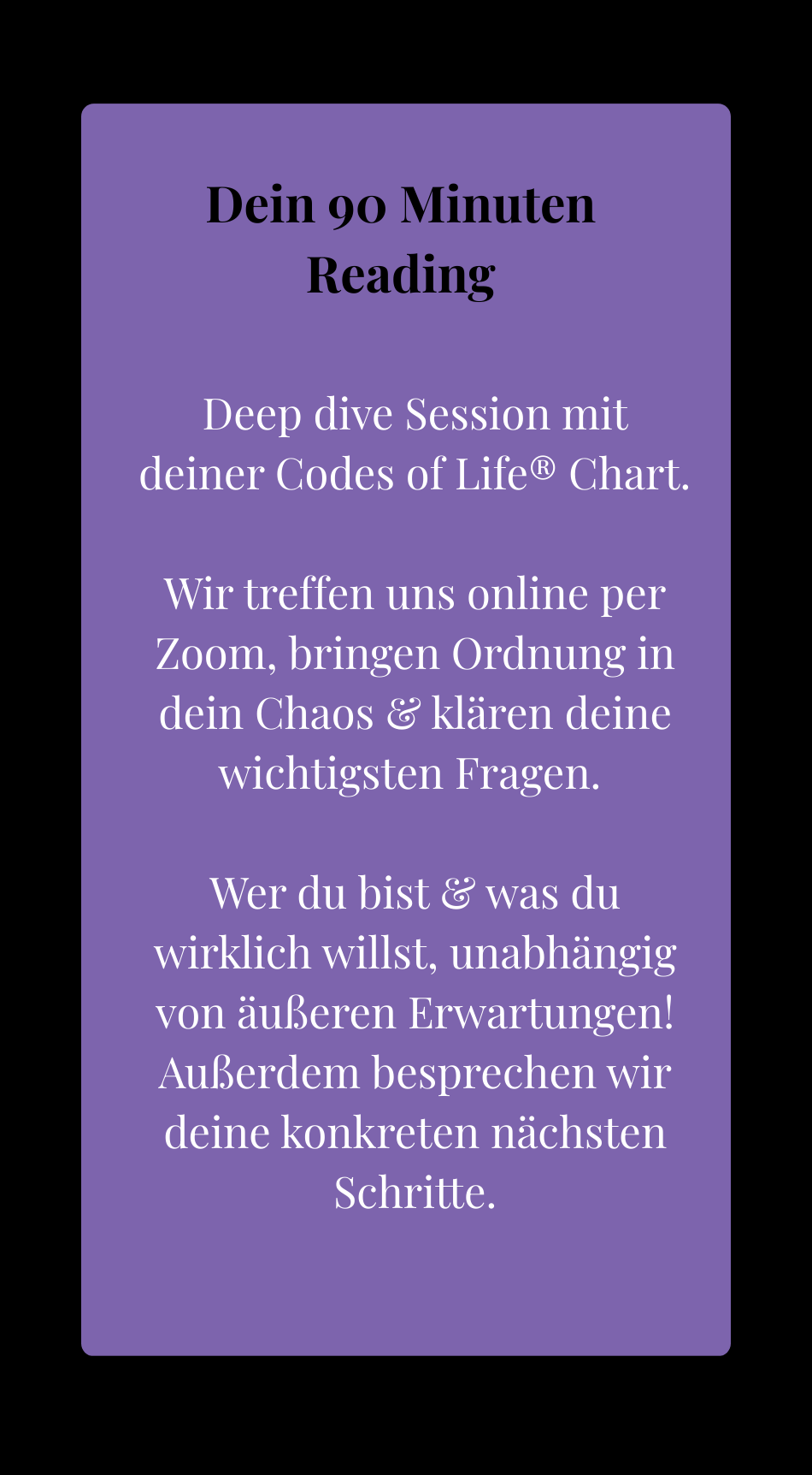 Das Reading für 333 € beinhaltet die 90 minütige Session, inklusive Zoom Aufzeichnung sowie deine persönliche, ca. 128-seitige Codes of Life® Analyse als PDF. Wenn du diese Analyse bereits erworben hast, beträgt der Preis für die 90-minütige Session 222 €.