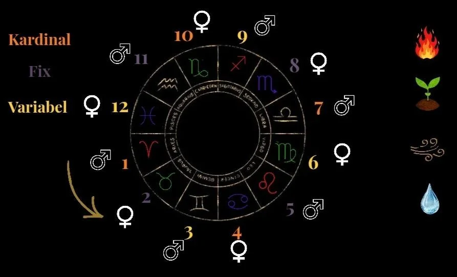Du lernst, wie die vier Elemente (Feuer, Erde, Luft, Wasser), die zwölf Tierkreiszeichen und ihre Qualitäten zusammenwirken und was das konkret für dich bedeutet.